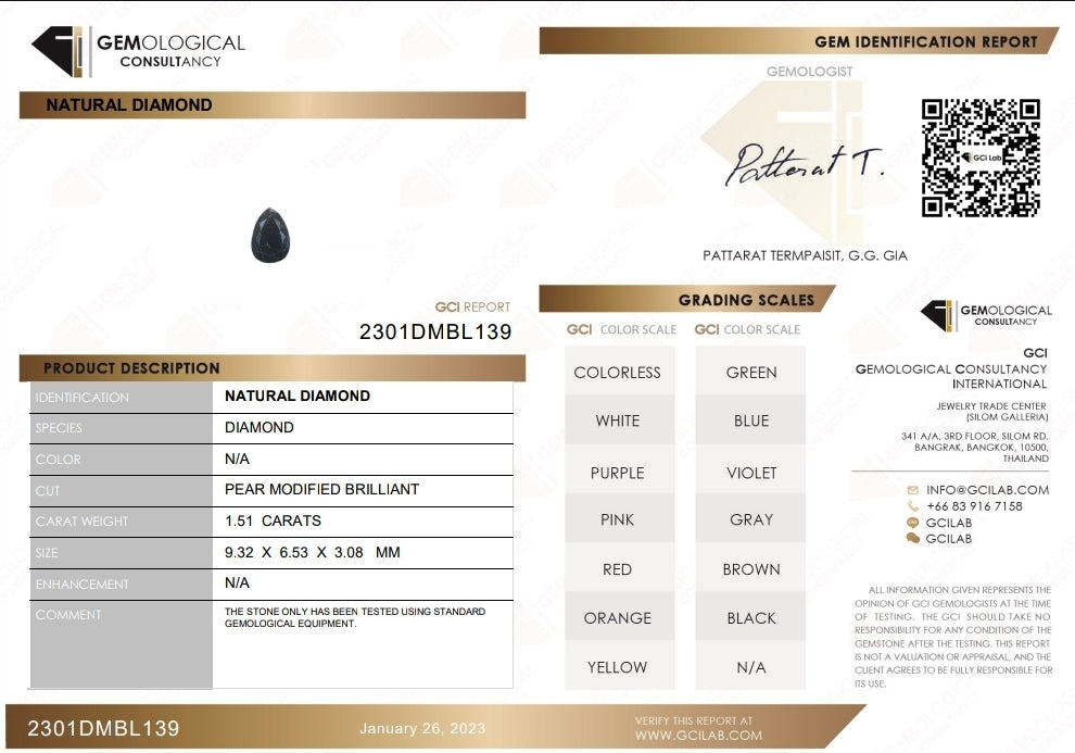 IDENTIFICATION NATURAL DIAMOND SPECIES DIAMOND COLOR N/A CUT PEAR MODIFIED BRILLIANT CARAT WEIGHT 1.51 CARATS SIZE 9.32 X 6.53 X 3.08 MM ENHANCEMENT N/A COMMENT THE STONE ONLY HAS BEEN TESTED USING STANDARD GEMOLOGICAL EQUIPMENT.