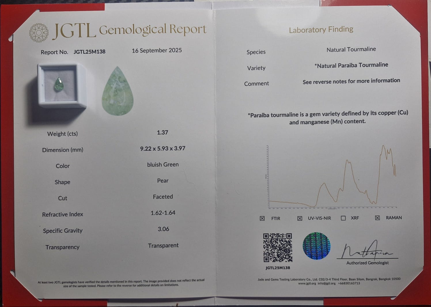 Ein Zertifikat (JGTL25M138) bestätigt die Echtheit und Qualität dieses außergewöhnlichen Paraiba Turmalins.
